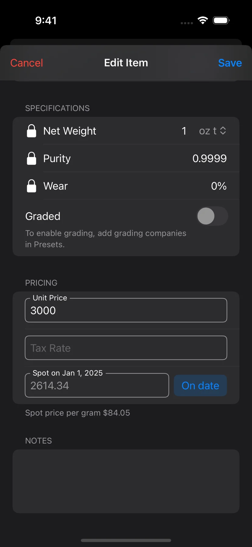- Net Weight: weight exluding alloy in troy ounces or grams. Only editable when a preset is not selected.